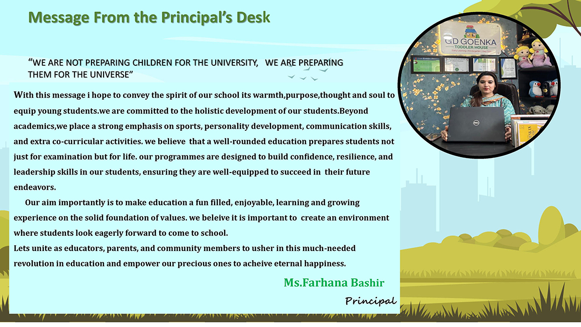 With this message, I hope to convey the true spirit of our school—its warmth, purpose, thought, and soul dedicated to nurturing young minds. We are committed to the holistic development of our students. Beyond academics, we lay strong emphasis on sports, personality development, communication skills, and co-curricular activities.